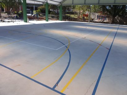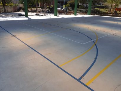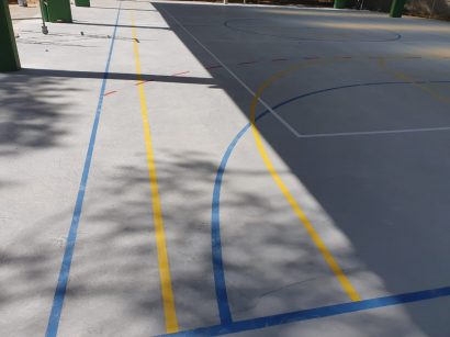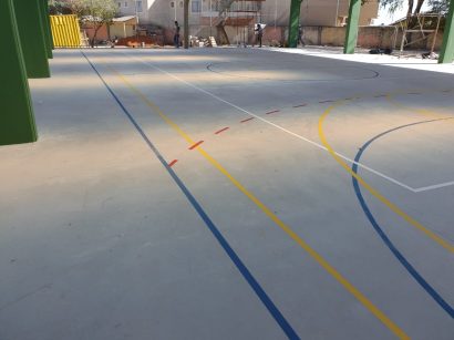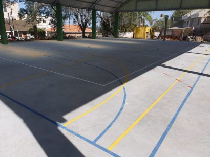 Pintura de faixas de modalidades esportivas em ginásio de esportes.