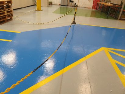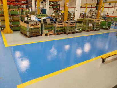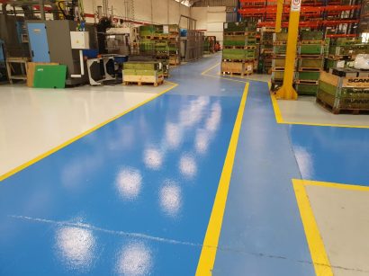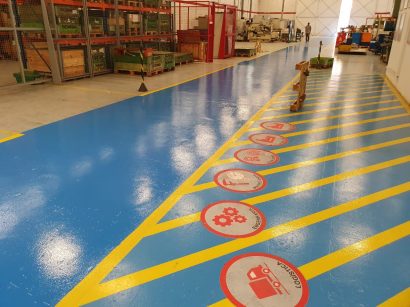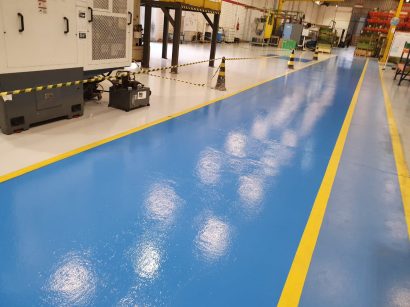 Pintura de piso em epoxi de alto brilho com marcação de sinalização horizontal