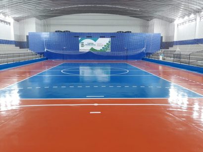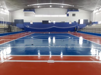Preparação e pintura de quadra poliesportiva com tinta PU pintar base e das faixas de modalidades.